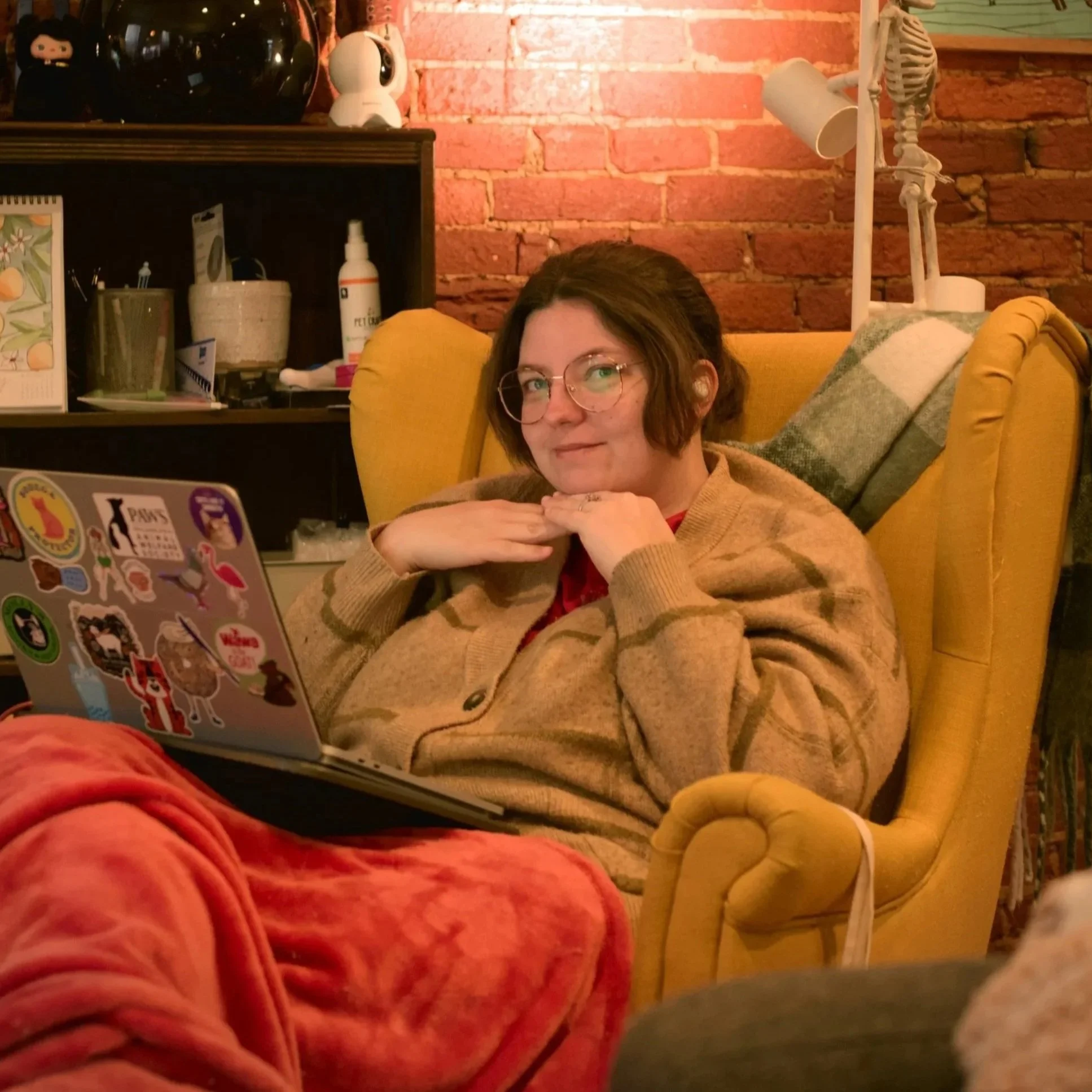 Victoria learned to crochet in college, but her practice truly took off in 2020. She creates a wide range of fiber pieces, including blankets, hats, scarves, cardigans, bags, dog sweaters, tapestries, and small crocheted creatures (amigurumi). She is especially drawn to colorwork and is actively experimenting with ways to merge her illustrations with crochet tapestries to create original, illustration-driven designs.